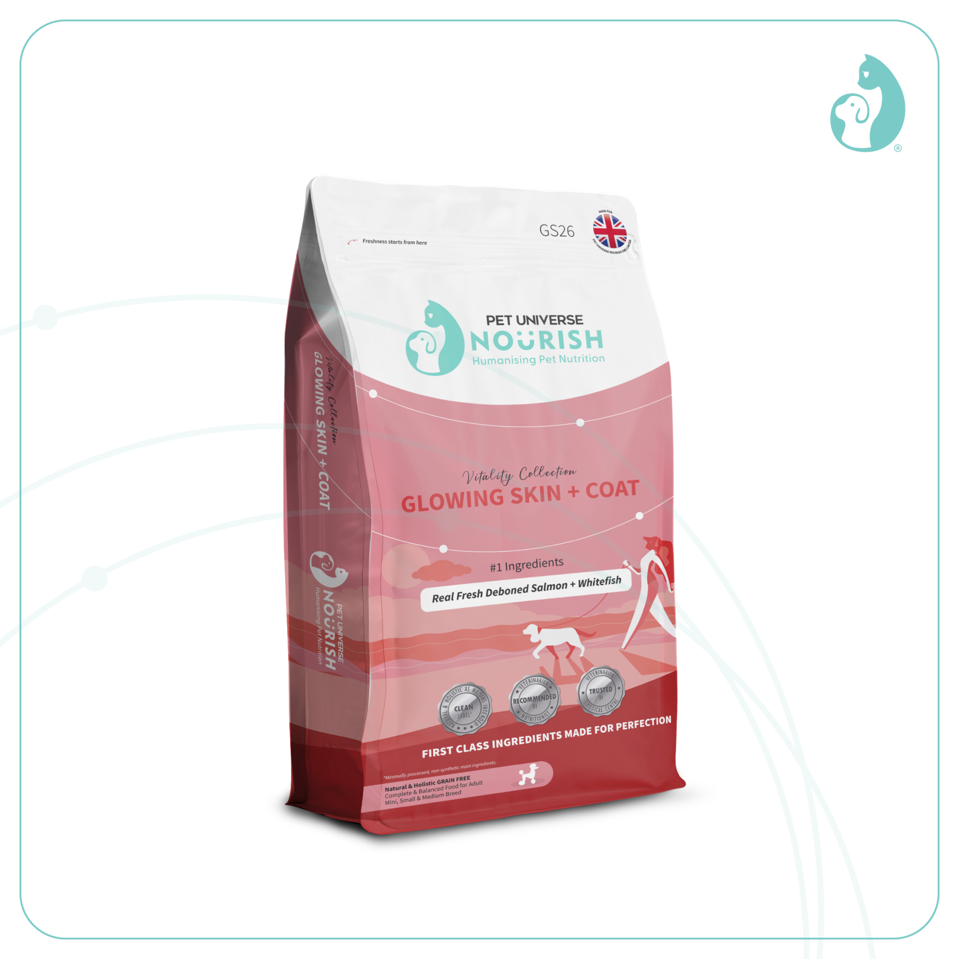 新鮮三文魚、馬鈴薯乾、乾番薯、綠豌豆、去皮豌豆、水 解雞肉蛋白質、脫水白魚蛋白、雞脂肪、脫水雞肉蛋白、乾紅菜頭漿、亞麻籽、角豆粉、蘋果乾、啤酒乾酵母、礦物質、三文魚油、乾雞蛋、乾藍莓、乾胡蘿蔔、乾薑黃、乾迷迭香、絲蘭、鹽酸葡萄糖胺、硫酸軟骨素